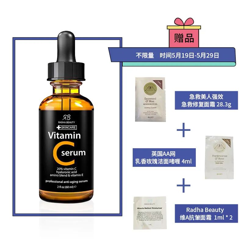 因为无论你防晒做得多严密,都会有少量的紫外线透过肌肤,产生自由基,引起老化、晒黑等一系列问题。VC产品后续搭配防晒,还可以增强肌肤对紫外线伤害的抵抗能力。活儿姐专门为你们pick的美国Radha Beauty VC精华,主打20%的VC衍生物SAP,价格也特别可爱!VC衍生物虽然没有原型VC祖宗效果那么猛,但胜在特别稳定。清新柑橘味道+爽肤水的质地,大油皮在夏天都Yes OK!关键60ml便宜大碗,分量是同等价位30ml精华的2倍!!!活儿姐建议你直接剁2瓶装,比大主播还便宜10块钱,限量份数一秒钟都不要犹豫!Radha Beauty精华的VC用的是衍生物形式,抗坏血酸磷酸酯钠SAP。