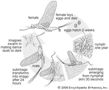 绝大部分蜉蝣的生活史示意图。比起成年阶段,稚虫阶段实在漫长。图片:Encyclopædia Britannica