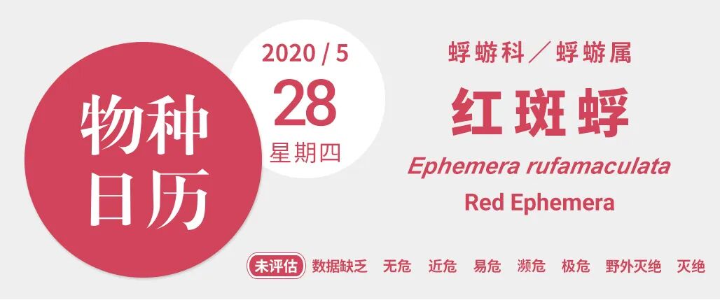 红斑蜉(Ephemera rufamaculata)属于蜉蝣目蜉蝣科蜉蝣属——这一串不加修饰“蜉蝣”告诉你,它是一种比较典型的蜉蝣;红斑蜉所在的蜉蝣属(Ephemera)即是蜉蝣科(Ephemeridae)的模式属。