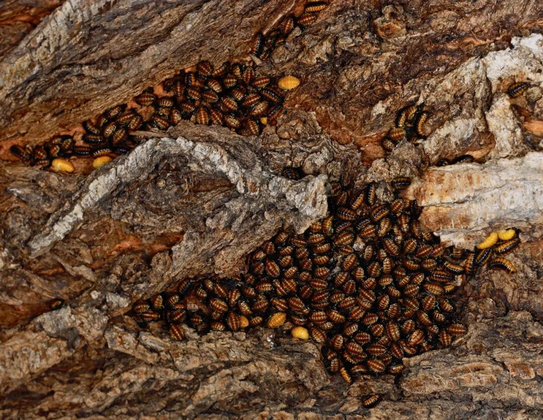 毛萤叶甲(Pyrrhalta sp.)在榆树树干上集中化蛹。图片:翦翳翎