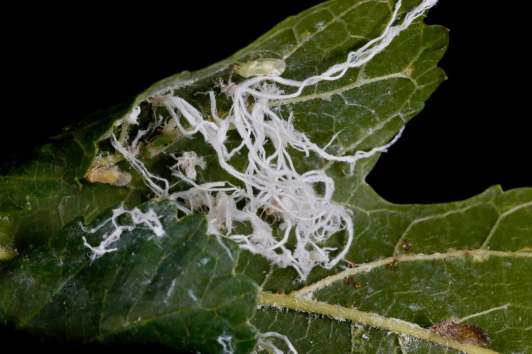 桑异脉木虱(Anomoneura mori)若虫和成虫群集。图片:翦翳翎