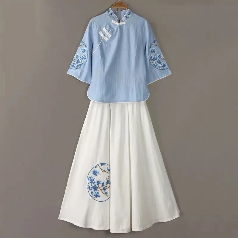 夏季复古改良唐装汉服女修身民国风刺绣棉麻套装连衣裙