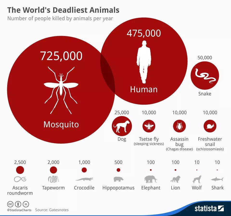 世界上最致命的动物排行,能够传播多种疾病的蚊子高居榜首。