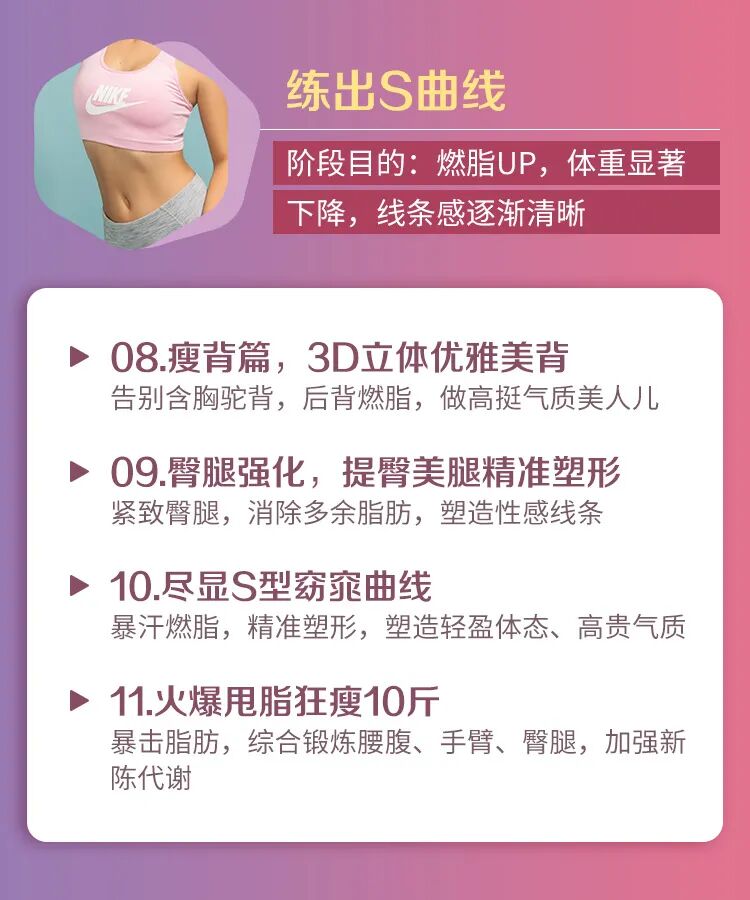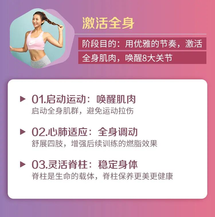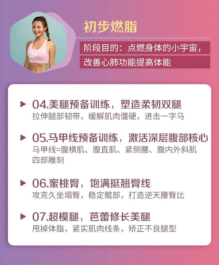 这套课程利用碎片化时间,每天练习10分钟,完成身体唤醒-燃脂-塑形3个循环,帮助我们体态、美颜、气质一步到位。