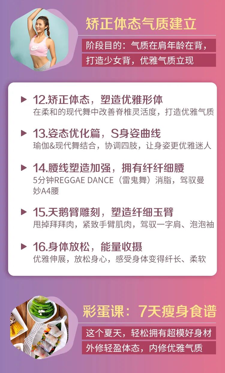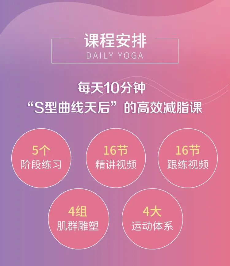 课程一共有16个课时:5大板块,针对全身各个部位,用50多个瘦身动作,瑜伽、普拉提、有氧操、现代舞等多种运动方式,带大家精准瘦身、做气质美人儿。