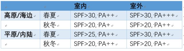 那在不同的场景里,防晒产品到底要怎么用呢?一般建议参照下表。