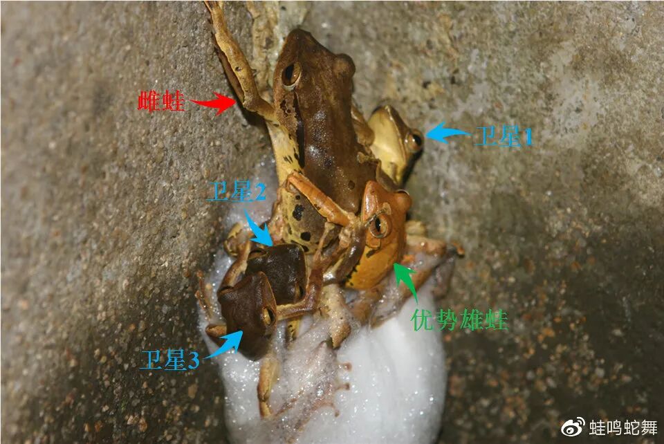 这种疯狂的群体繁殖行为不仅对“卫星”雄性有好处,对雌性也不是完全不利的。在雌性资源极为稀缺的情况下,“卫星”雄性可以传宗接代,对于雌性而言,增加的精子可以提高后代基因的遗传多样性。但我们并不知道这种群体繁殖行为是雌蛙喜闻乐见的,还是无奈被动接受的。