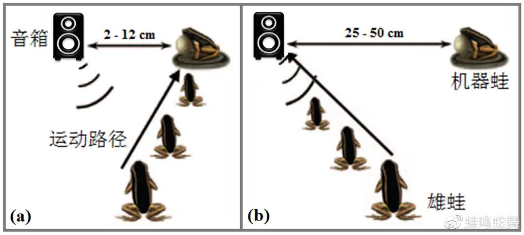 为了回答这个问题,科学家用喇叭和机器蛙,给一种幽灵箭毒蛙(Epipedobates femoralis)表演了“双簧”。喇叭播放雄蛙的叫声,机器蛙呈现同步伸缩的鸣囊。当喇叭和机器蛙距离较近(12厘米以内)时,雄性箭毒蛙会攻击机器蛙,很显然,它们误以为声音是机器蛙发出的。喇叭和机器蛙相距较远(超过25厘米)时,它们才意识到声音是从机器蛙旁边的喇叭发出来的,改变路线去攻击喇叭。