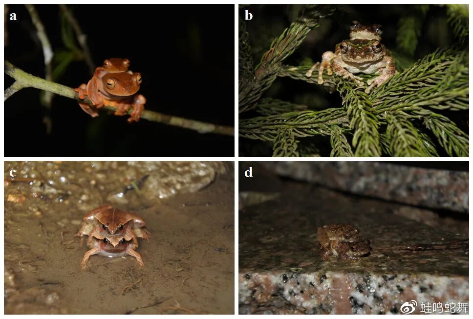 抱对的蛙蛙们(背上为雄性)。a,红蹼树蛙(Rhacophorus rhodopus);b,锯腿原指树蛙(Kurixalus odontotarsus);c,小弧斑姬蛙(Microhyla heymonsi);d,海南刘树蛙(Liuixalus hainanus)。图片:朱弼成
