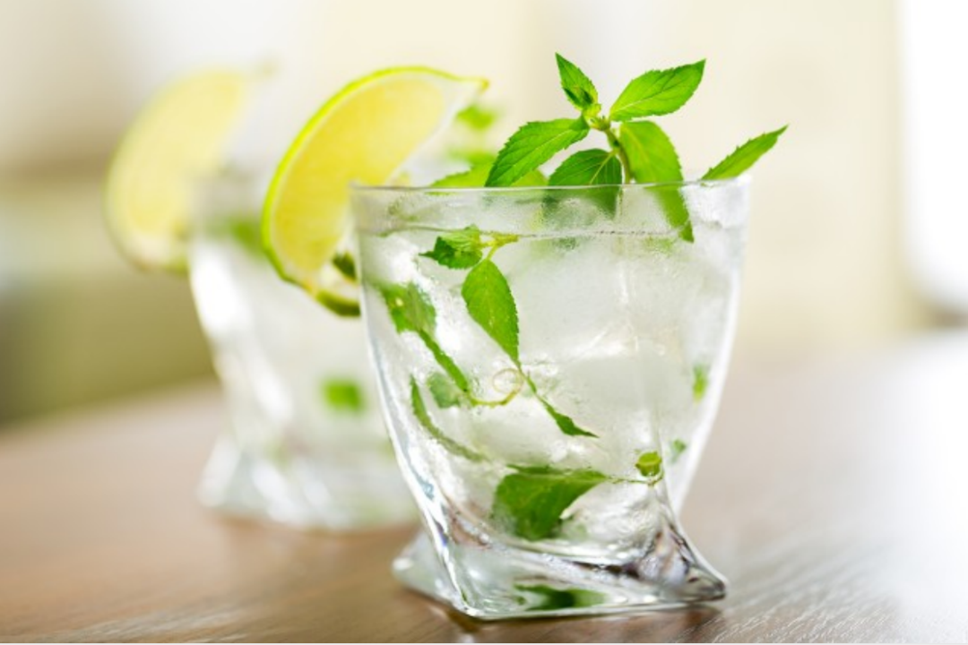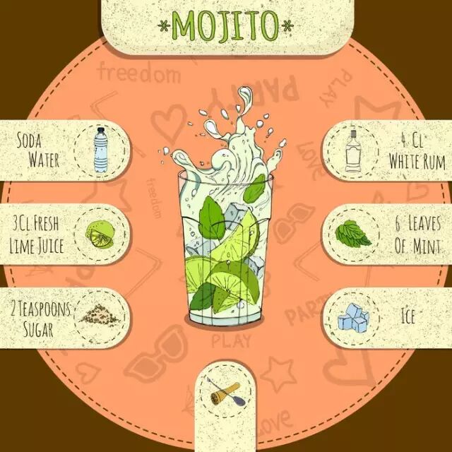 40ml 古巴白郎姆酒,30ml 新鲜青柠汁,6片薄荷叶,2茶匙白糖,苏打水。
