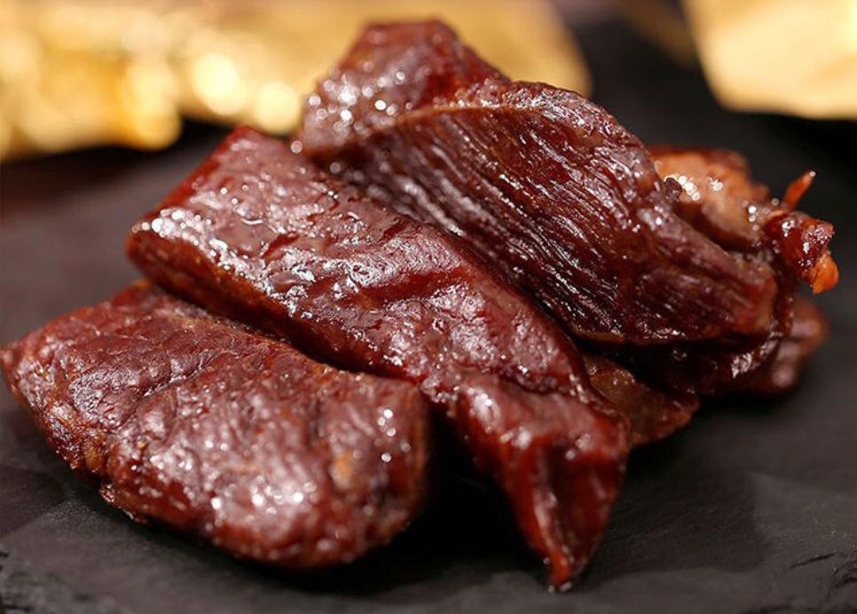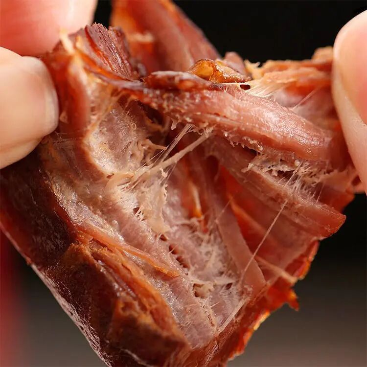 在这样的环境下长大的黑牛,牛肉纹理清晰,肉汁饱满,脂肪与瘦肉分布适中,形成了好看的大理石样花纹。而且肉质等级可以达到A3,甚至作为北京奥运会、世博会等指定供应牛肉。回到牛肉干上,用来做雪花软牛肉的是雪花上脑部分。上脑,放在牛排界就是第一梯队核心选手之一啊,这次被做成即食牛肉后,依然不负众望,肉质紧实,多汁细腻,软硬适中,就是那么得劲儿~好肉是基础,人工生产也是半步马虎不得。雪花软牛肉的生产工序多达10几道,经过洁净、冷温处理,人工剔除肉的筋膜无肉筋,不干不硬,有嚼劲还不塞牙。真空包装,携带方便,吃着也不脏手,尤其很适合好朋友间分享。长时间工作累了,晚上躺在沙发上嘴巴寂寞了,“嚓”撕开包装,大口吃牛肉产生的快乐力量你想象不到!对了,有时打开包装可能会看到白色颗粒,别担心,那是珍贵的脂肪,有脂肪衬托的肉肉才好吃呢~如果不想直接吃到凝固脂肪,可以放在热水里吃前稍稍加热一下,相信我,加热后味道更美!