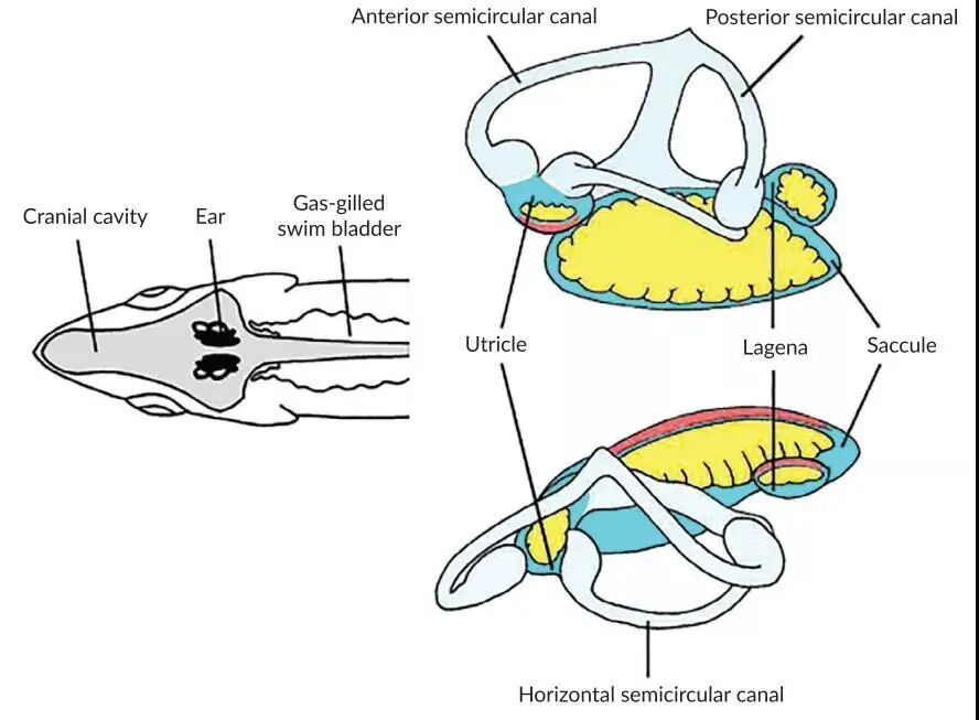 左图:鱼类的内耳位于颅腔内;右图:除了三对和我们很相似的半规管外(浅蓝色),还有三对耳石(黄色),靠近感觉表皮(红色)。图片:Popper, A. N. et al. / Journal of Fish Biology (2019)
