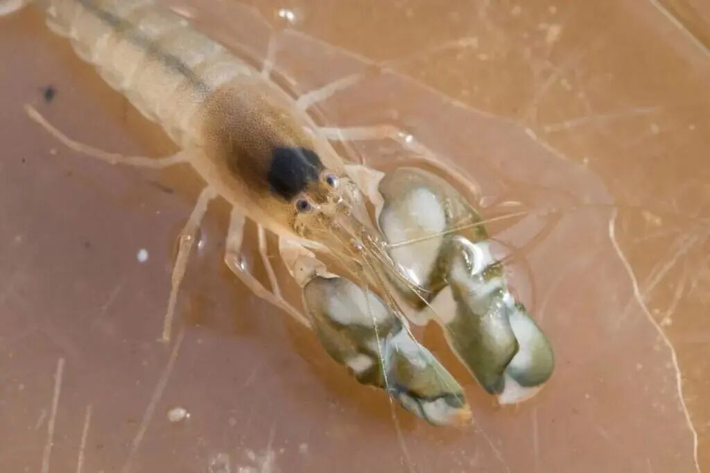 虾如其名,与众不同的大螯就是它的手枪,枪虾会以超高速闭合“手枪”,挤出的水柱冲击周围水体产生气泡,气泡瞬间爆裂,发出“枪声”,同时伴随冲击波,一下击晕它们的猎物。此外,枪虾还会用这些声音来交流。所以,当珊瑚礁里的很多只枪虾都在捕食、交谈,“噼里啪啦”就成了珊瑚礁的背景声。