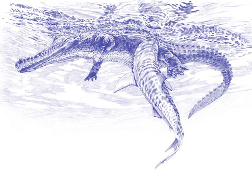 最后一种可能性最有戏剧性,可能是鲨鱼攻击了鳄鱼的腹部,而这只鳄鱼又正好消化道里装得满满的,鲨鱼一口咬下,肠道破裂,粪便掉了下来形成化石。而鲨鱼强而有力的咬击正好穿过腹部、越过肠道,在里面的粪便上留下了齿痕。
