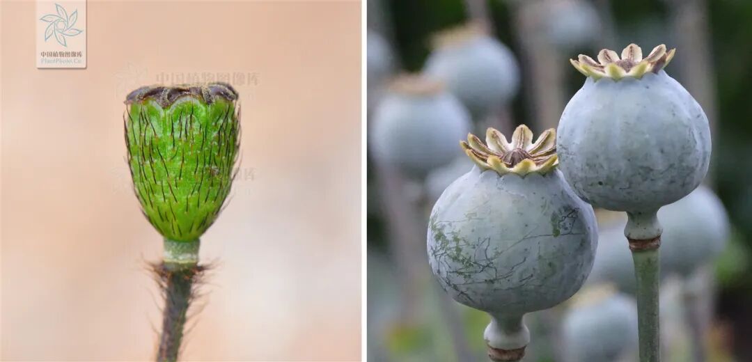 野罂粟果实(左)和罂粟果实(右)。图片:朱仁斌 / 中国植物图像库;needpix