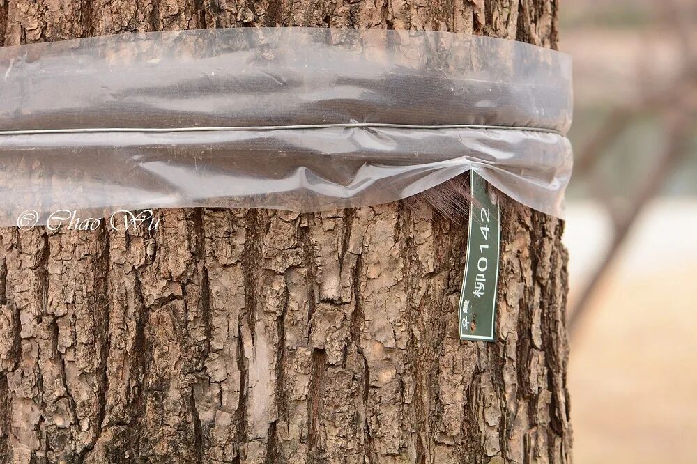 另一种变化是光面的塑料改为类似黄板的粘胶,这可以有效灭杀跳跃能力很强的斑衣蜡蝉的若虫,如同家中粘蟑螂的粘板一样,把在树干上下活动的虫害灭杀。比较少见的是带有诱剂的“腰带”,作用和前者大同小异,但应该有更高的针对性;不过这种高大上的装置应该尚在实验阶段,我仅在北京林业大学的校园中见到。