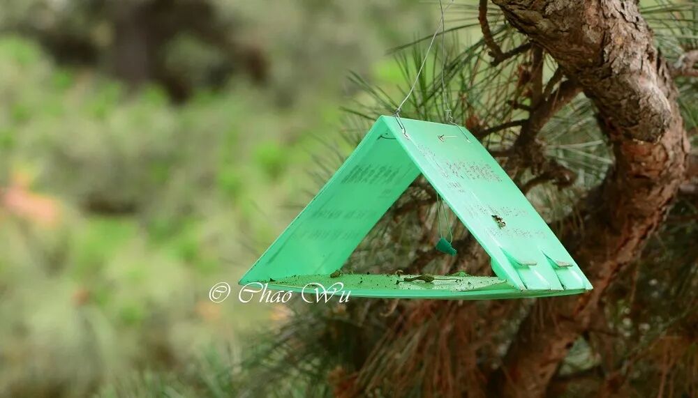 这个性诱剂小屋简单方便,并且有一定的专杀性,对防治市区的槐尺蛾效果显著。但因为底部有粘板,也有一定的误伤可能,也有极少案例造成鸟类死亡。