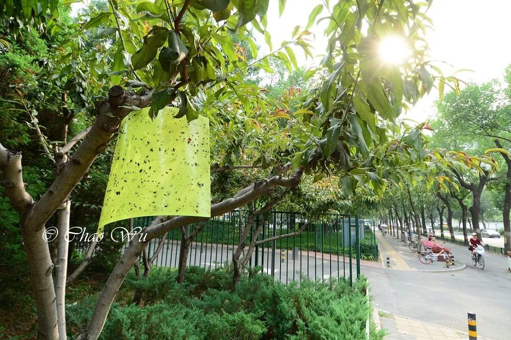 这是最常见也最易被关注到的一种工具,在公园或道路边的绿化带上,非常容易遇见涂满胶的黄色粘板,我们常称之为黄板。之所以选择黄色,是因为很多小型飞虫都对黄色这样的明亮色彩有趋性——这应该是大家都有的常识,每到春天都会避免穿黄色衣服出门,因为“招腻虫”,而“腻虫”就是对蚜虫之类小型飞虫的泛称。对于绿地植物而言,蚜虫也是主要的害虫之一,在需要尽量避免喷洒农药灭杀的情况下,黄色的粘板就是个很好的选择。由于各个品种的桃树尤其容易生“腻虫”,因此它们更常悬挂在桃树上。