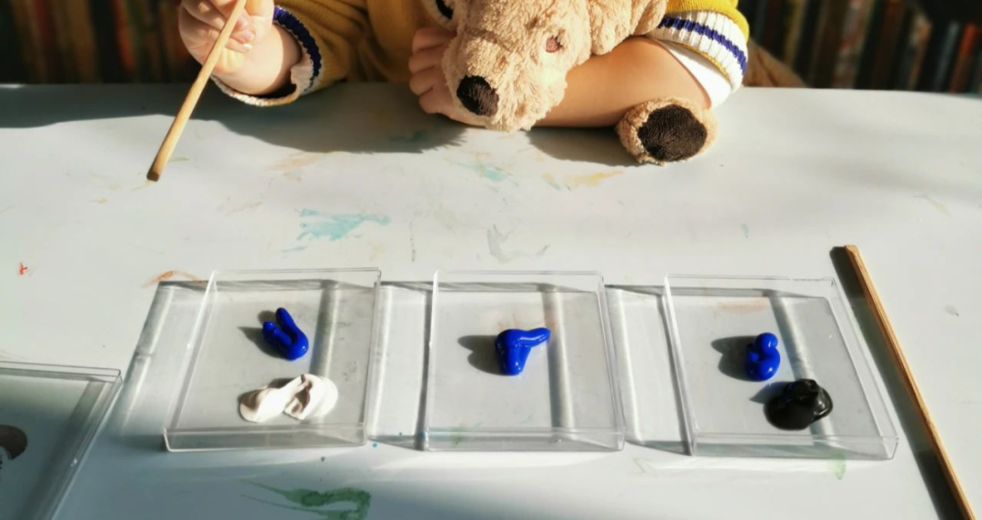 请孩子随意挑选一种颜色,通过加入黑色颜料和白色颜料,来改变颜色的深浅。