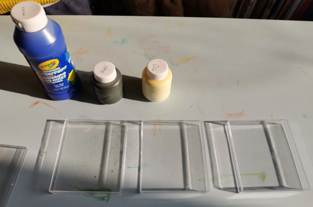 提前调配好红、黄、蓝的液体,让孩子尝试混合。