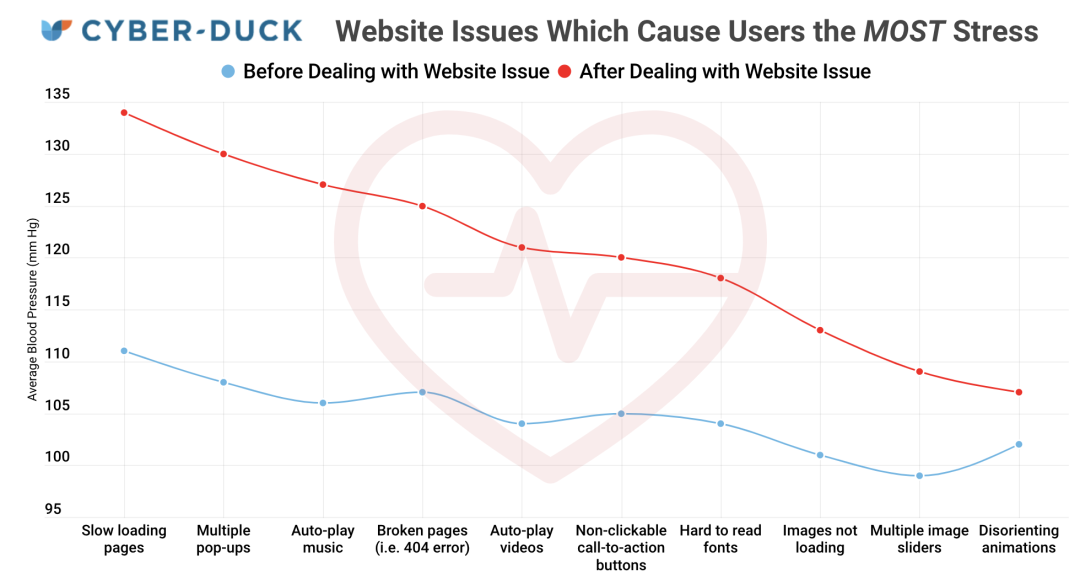 测试结果发现,网站加载缓慢会用户的血压直接飙升,弹出窗口则使他们的血压升高20%,自动播放音乐和莫名其妙的动画也会让他们的血压有所上升。