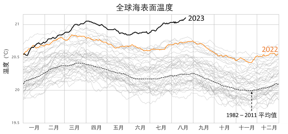 根据最新数据,全球海洋最上面的2000米吸收的能量自1990年以来逐年上升,仅今年前七个月,上升的能量已经比2022年的平均高出至少10^22焦耳[2]。