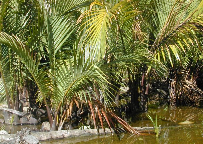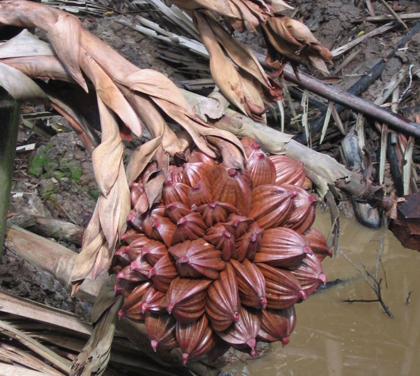 水椰的果实长得很特别,它们的果序球形,由数十个心皮发育而出,这样让它们的外观来看,就像是一把流星锤。取下一个果子剥开,会发现里面有半透明的果肉——这主要是它们肉质的中果皮。果肉取出加以糖渍之后,便是亚达子了。