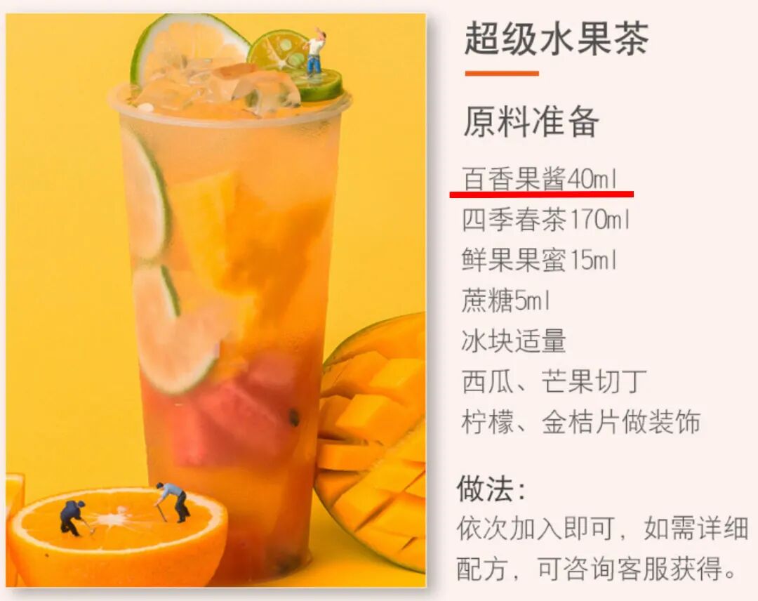 你可以试试把西瓜、百香果、柠檬之类的水果切成块,加点水泡一泡,尝尝味道怎么样——基本就是很淡很淡的水果味和酸味,和奶茶店的味道完全不能比。