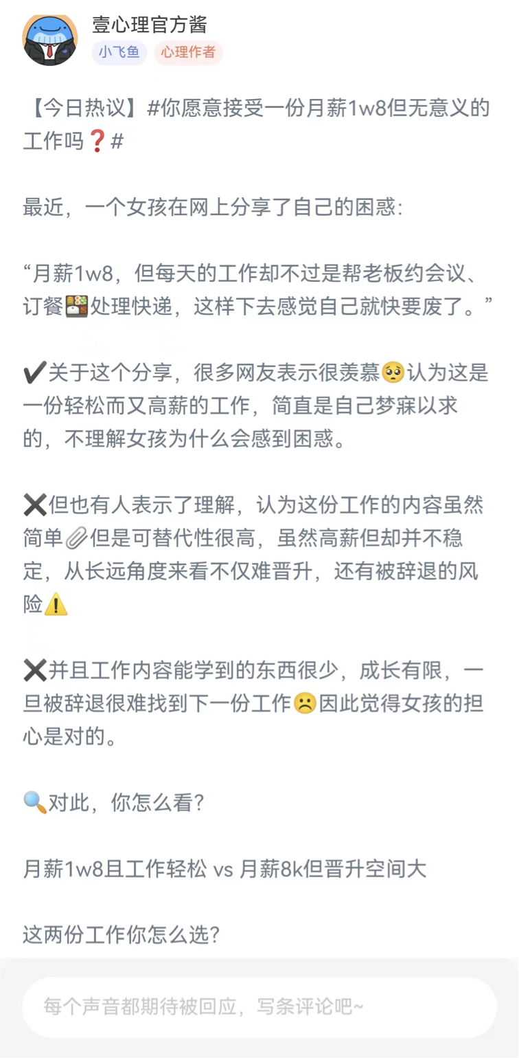 于是我在壹心理APP发起了一个讨论:月薪1w8 VS月薪8k但晋升空间大,选哪个?