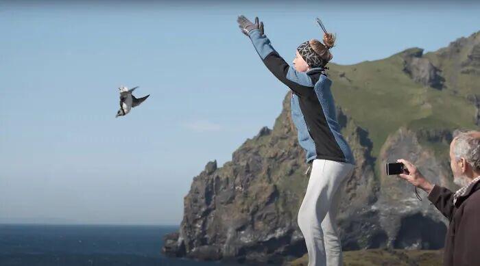 居民通常会在海岸悬崖处放生小海鹦,这里也是它们原本应该起飞的地方。人们一般双手抓住海鹦,将它向上抛到空中,也有人会像扔橄榄球一样单手投掷。