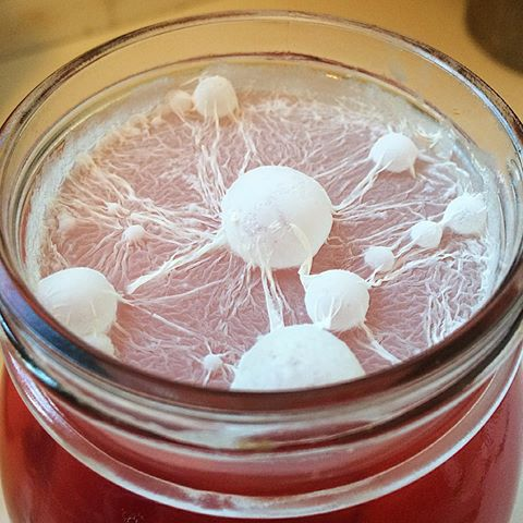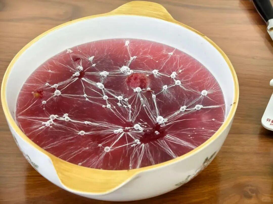 照片中,一碗红宝石色的杨梅汁液表面,竟浮着一层白色不明网状物,如同神经网络或微缩的城市地图。