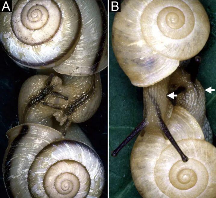 A为两只右旋蜗牛交配,B为左旋蜗牛(上方)和右旋蜗牛(下方),箭头所指为它们各自的生殖孔,彼此的生殖孔无法连接|参考文献[2]