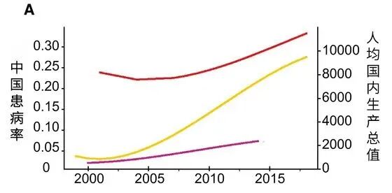 图中红线、黄线、紫线分别为中国非酒精性脂肪性肝病(NAFLD)患病率、人均GPD、肥胖率随时间的变化。丨参考资料3