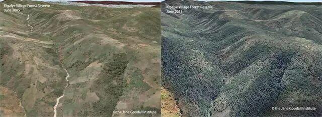 贡贝溪国家公园附近一个名为Kigalye的村庄在2005年(左)和2013年(右)的森林覆盖情况。珍·古道尔研究会在这个地方推动了森林恢复工作丨janegoodall.org
