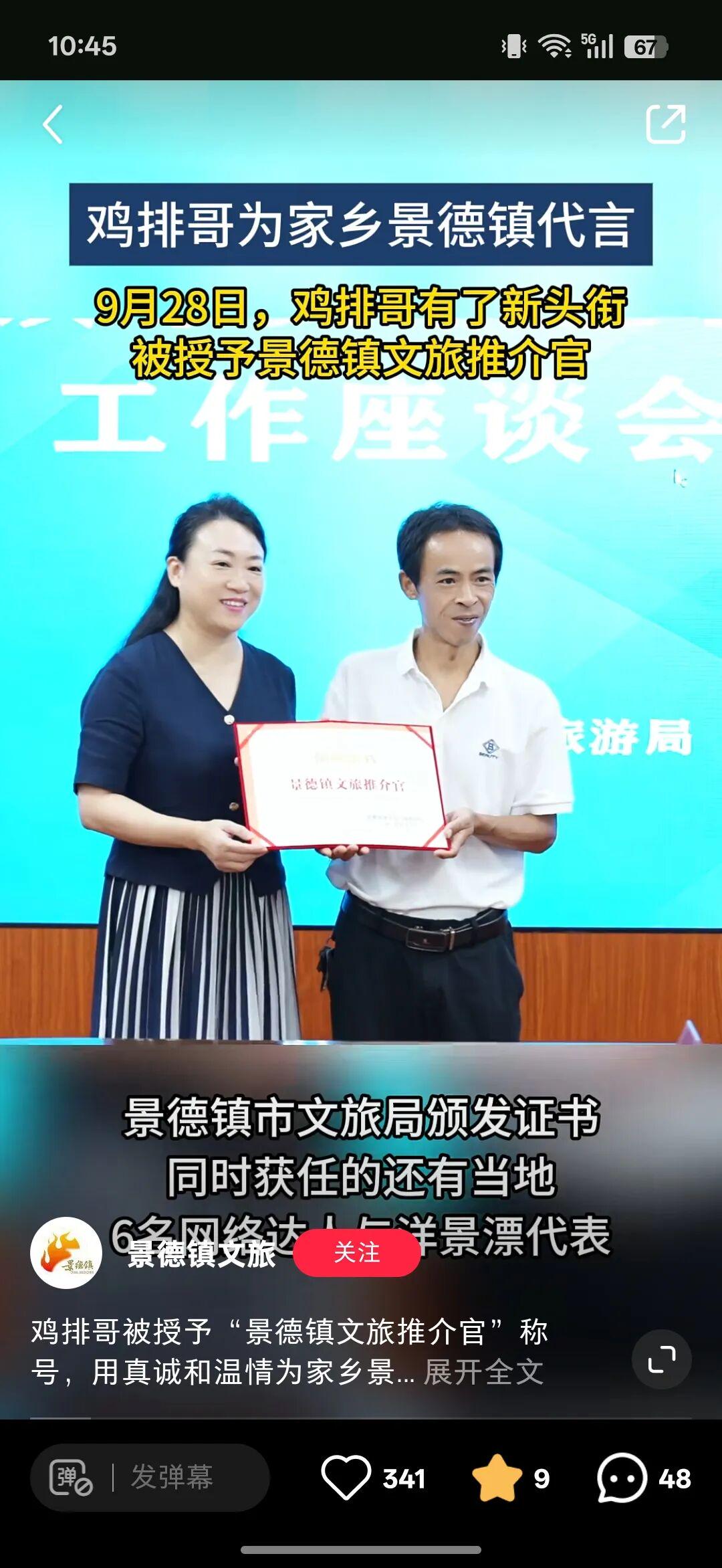 9月28日景德镇市文化广电旅游局授予他“景德镇文旅推介官”称号,甚至还为他配备2-4人的工作专班城管,维持国庆客流秩序……这下鸡排哥算是火出圈啦!