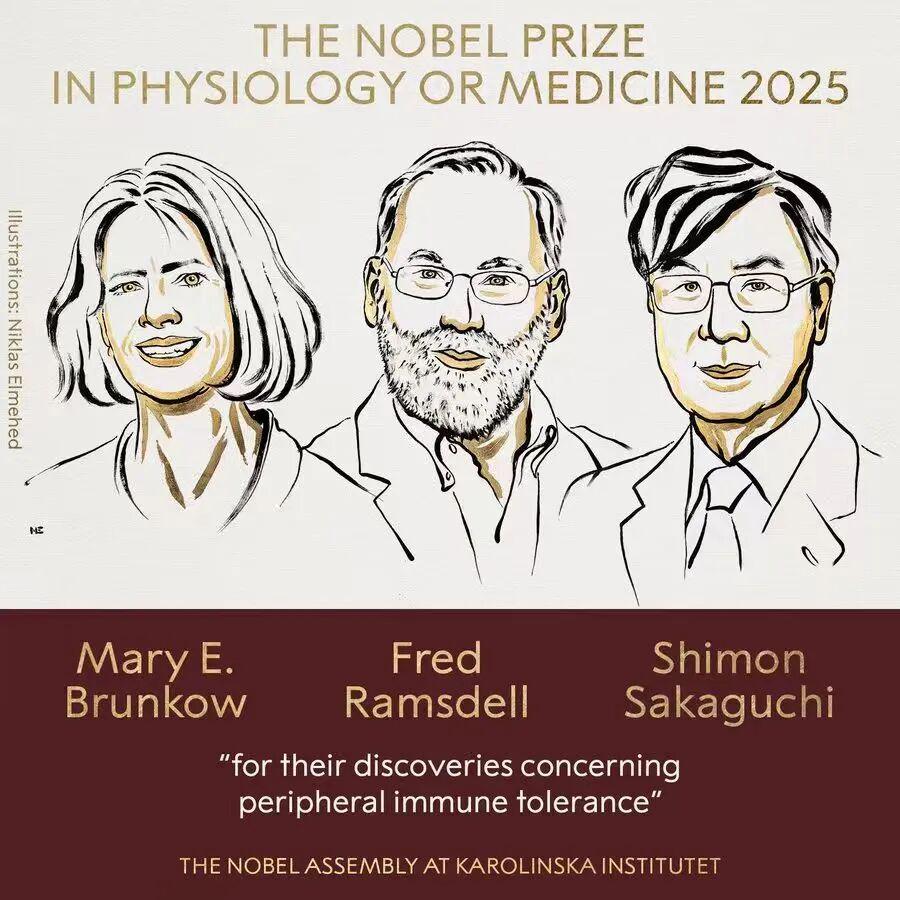 2025年诺贝尔生理学或医学奖公布!获奖者是 玛丽·布伦科(Mary E. Brunkow),弗雷德·拉姆斯德尔(Fred Ramsdell)和坂口志文(Shimon Sakaguchi) 。 以表彰他们在外周免疫耐受方面的发现。