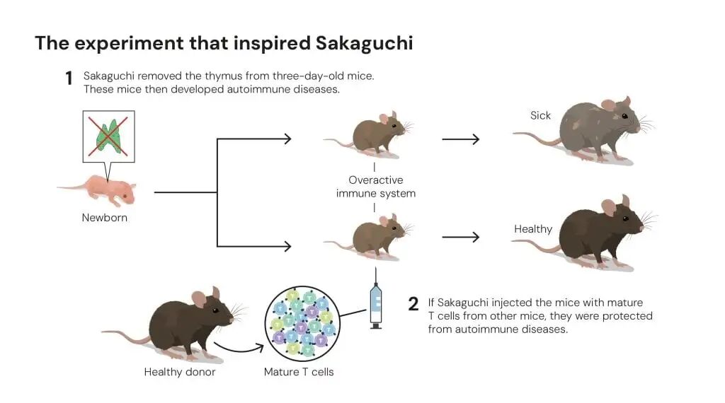 但结果恰恰相反。切除新生小鼠的胸腺后,它们的免疫系统反而变得异常活跃,攻击自身组织,引发各种自身免疫病。坂口志文猜想,一定存在某种细胞,专门负责给过度兴奋的免疫系统“踩刹车”。
