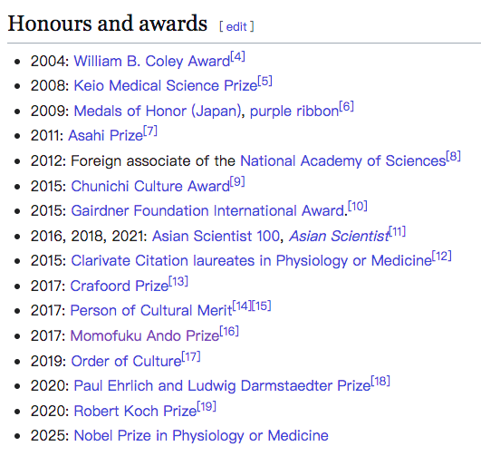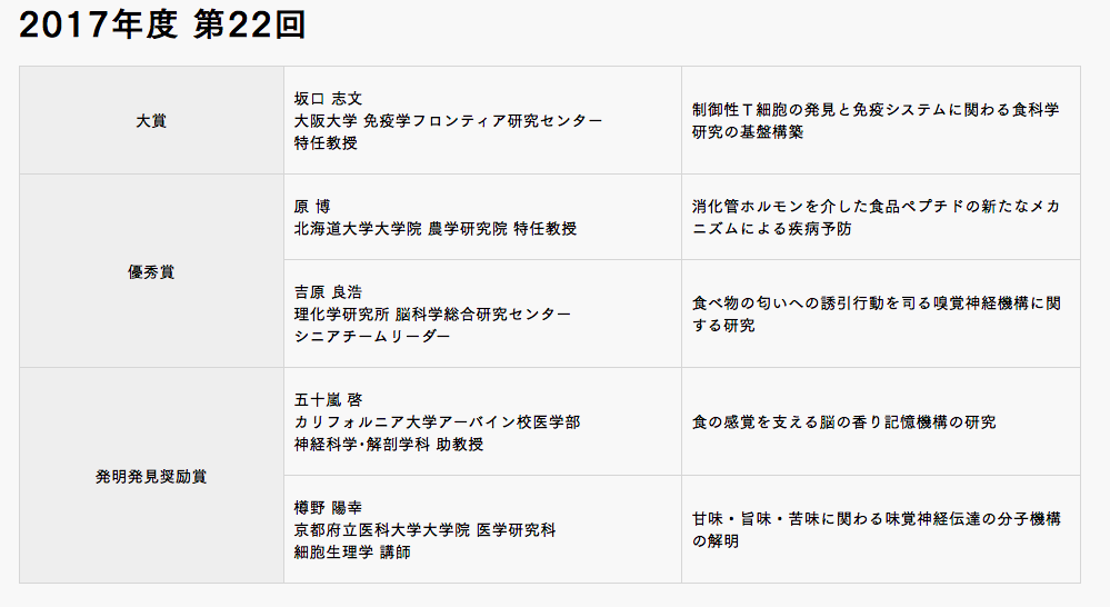 2017年的这个奖太引人注目了:Momofuku Ando,泡面之父安藤百福。安藤百福奖,是根据安藤百福遗愿设立的奖项,旨在表彰为食品科学、新型食品开发做出贡献的人。2017年,坂口获奖的理由是“发现调节性T细胞及其在缓解食物过敏和通过肠道细菌调节免疫功能方面的重要性”。