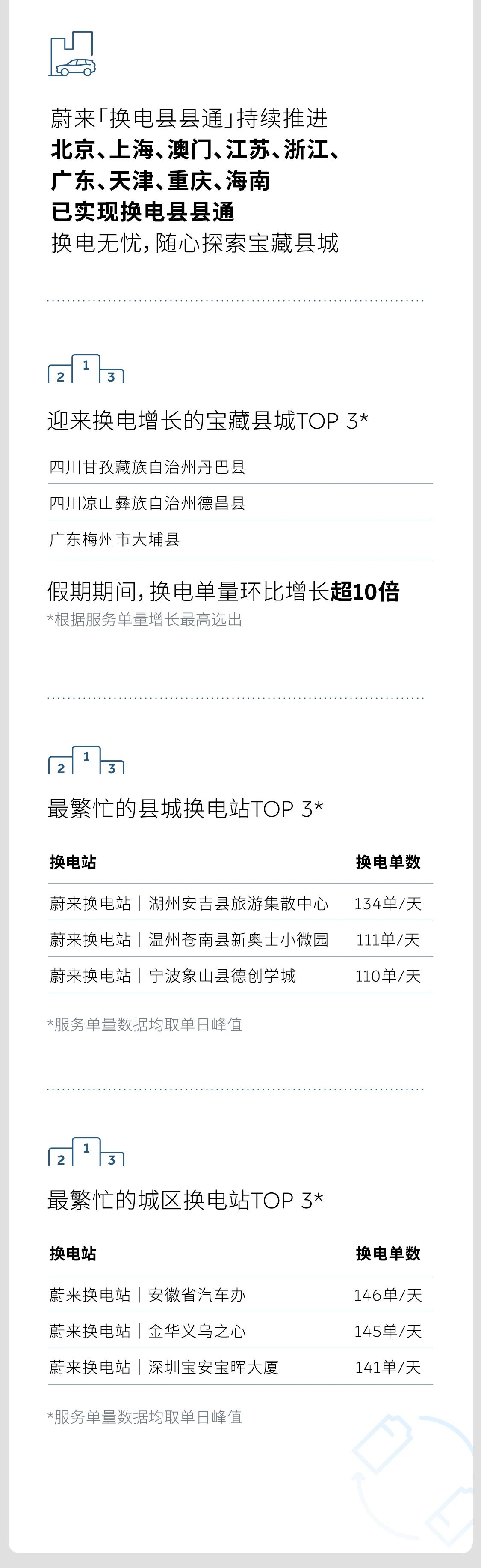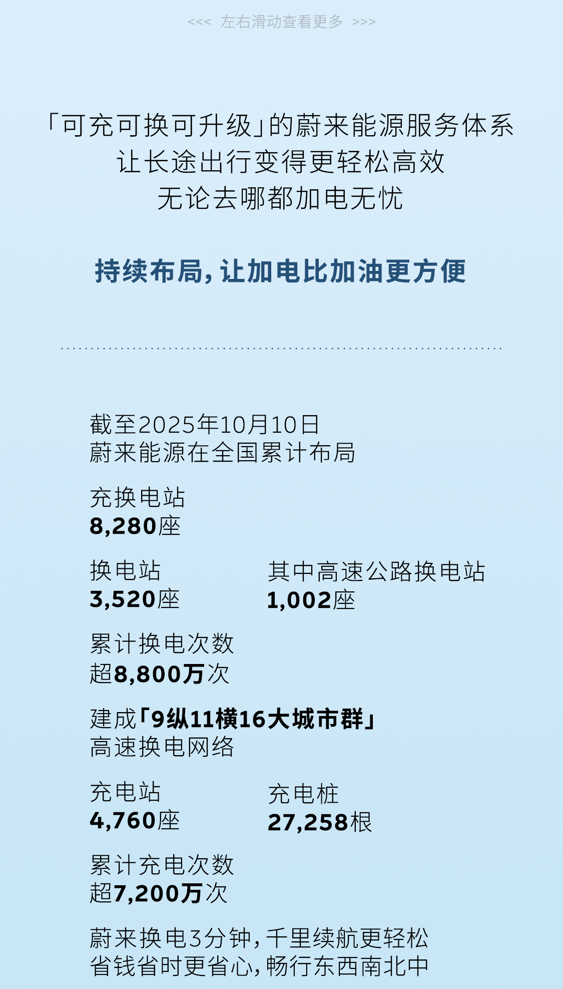 2025年10月9日,蔚来能源发布《2025十一假期用户加电报告》。十一假期,蔚来能源全国8280座充换电站,累计为用户提供超192万次充换电服务。遍布全国的3520座换电站,累计为用户提供109.8万次换电服务,创历史新高;4760座充电站累计为用户提供82.7万次服务,超85%订单来自其他品牌新能源用户。