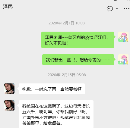 9号晚上狂欢了一阵子之后,向同事转达了好几位媒体老师的采访诉求之后,我才想起来要去祝贺一下余老师。布达佩斯时间与北京时间的时差是6小时,他在当地时间的晚上11点多回复了我的消息,并预告了接下来将要回国为拉斯洛的两本新书《温克海姆男爵返乡》《赫尔施特07769》做一系列推广活动。