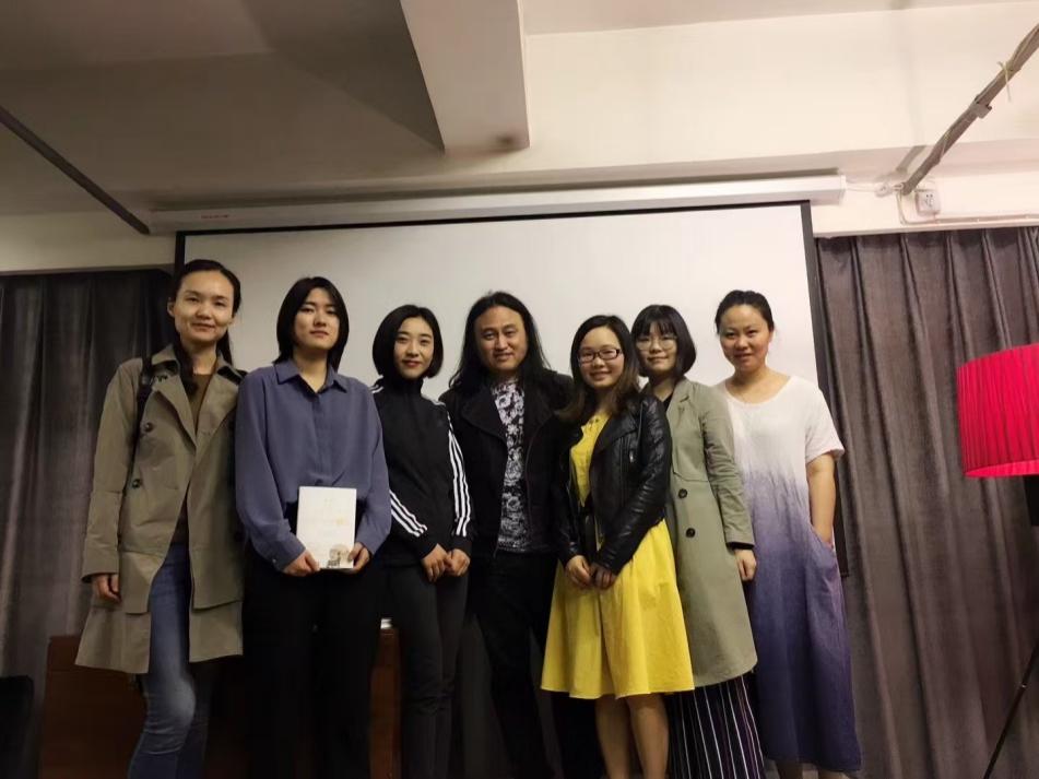 2018年春,余泽民携译著《撒旦探戈》《烛烬》与作家鲁敏在先锋书店做分享活动。左起第四:余泽民,第五:本文作者徐琼玉,最后一位:《撒旦探戈》责任编辑王珏