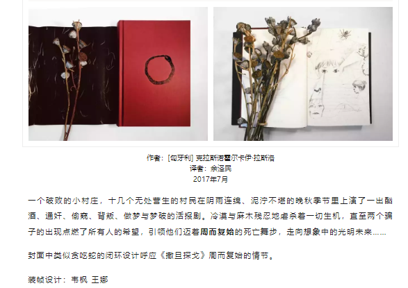 说完封面,再回到内容。其实《撒旦探戈》这本小说以及著名匈牙利导演贝拉·塔尔由此改编的同名电影(片长7个多小时!),我都没有完整看过。一方面确实是因为有难度,另一方面也跟营销编辑的工作节奏有关。我们常常是跟着新书跑,新书一本接一本的出,营销编辑的工作精力和重心便也一个“项目”一个“项目”地不断变化。花好几个月甚至一年时间集中去做某一本书的营销,以现在的人手和惯例来看,这完全是不可能也不现实的事情。但是时隔7年,我仍然记得每次翻开这本书,循环往复的长难句,对村庄的描述给我带来的震撼与神奇“魔力”。译者余泽民老师在序言中的率性感受,也让我每次读到都忍俊不禁:“译稿发出去后,我跟责编抱怨:‘简直就要憋死我了!现在我真想跺脚,喊叫,砸东西,摔书,再也不想看到它!’”的确如此,无论是写作,翻译,还是编书,有些时候过程总是漫长又痛苦的。关于《撒旦探戈》晦涩难懂的内容,我想书评人蔡辉(笔名:唐山)10月9号晚上在“新京报评论”公众号上发表的快评中说得比较中肯:“严肃文学追寻真实,它超越了人的感官极限”。