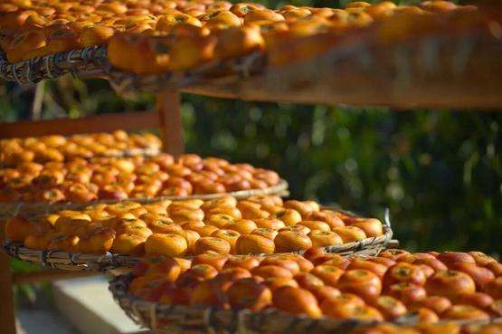鲜活的柿子一个个饱满多汁,成为挂着白霜的柿饼后,仿佛成了一个个能甜掉牙的小蜜罐,甜蜜着入冬后的三分之一个中国。