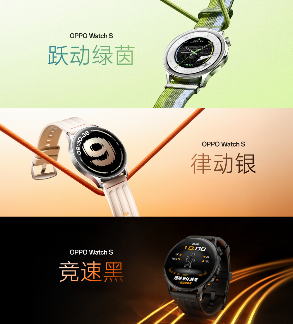 OPPO Watch S 带来跃动绿茵、律动银、竞速黑三款配色,其中,跃动绿茵编织带获蕉内同款 5A 级抗菌认证,100 次水洗仍长效抗菌;律动银与竞速黑氟橡胶带较上代更薄软轻盈。