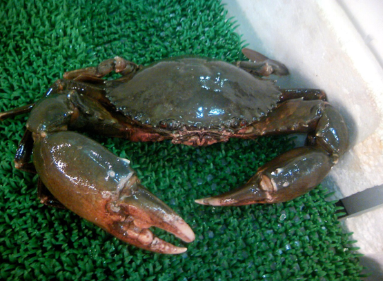 拟穴青蟹的色泽和锯缘青蟹比较像,但蟹螯和蟹脚上没有花纹,体型也比锯缘青蟹小,是人工养殖比较多的品种。
