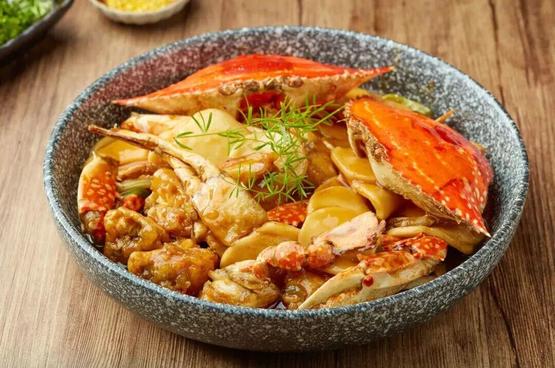 碳水爱好者还可以试试梭子蟹炒年糕。将梭子蟹切成大块,和软糯的年糕片同炒,再加调料收汁,不仅蟹肉的口感仍然饱满,年糕也吸足了蟹肉的鲜味。