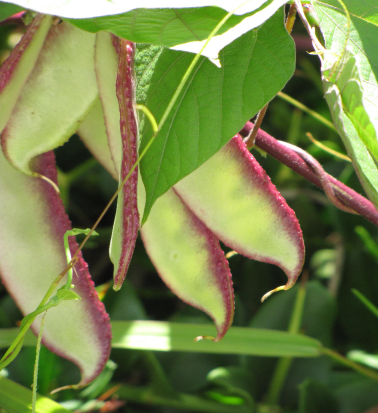 扁豆植株有攀援的特点,且不需要过多照料,一个夏天都能源源不断地结出豆荚。古代描写田园生活的诗句里,常见“豆棚瓜架”之语,写的就是农家搭棚架种扁豆的场景。紫花扁豆和白花扁豆是我国最常见的栽培种,花色与豆荚色也有所关联,紫花扁豆的豆荚微带紫色。