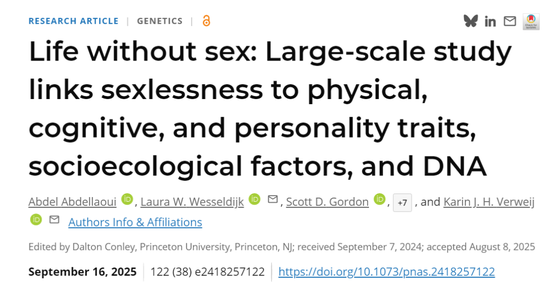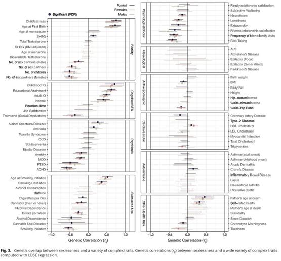 [1]Abdellaoui, A., Wesseldijk, L. W., Gordon, S. D., Pasman, J. A., Smit, D. J., Androvičová, R., ... & Verweij, K. J. (2025). Life without sex: Large-scale study links sexlessness to physical, cognitive, and personality traits, socioecological factors, and DNA. Proceedings of the National Academy of Sciences, 122(38), e2418257122.