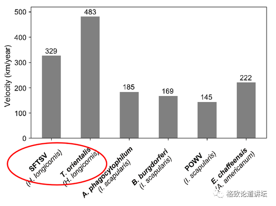 首先我们比较了一下两个病原,一个是发热伴,另一个病原是也是长角血蜱传播的,是一种寄生虫叫东方泰勒虫。发现长角血蜱传播病原的速度远快于其他一些蜱虫。