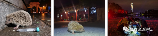 实际上,城市里的蜱虫和刺猬的密度比大家想象的要高的多。你看左边这是清华大学的,中间这个是北大的。我在校园里5-10分钟就能把第一个刺猬找出来。这边是奥森公园的那个塔,大家都认得吧?